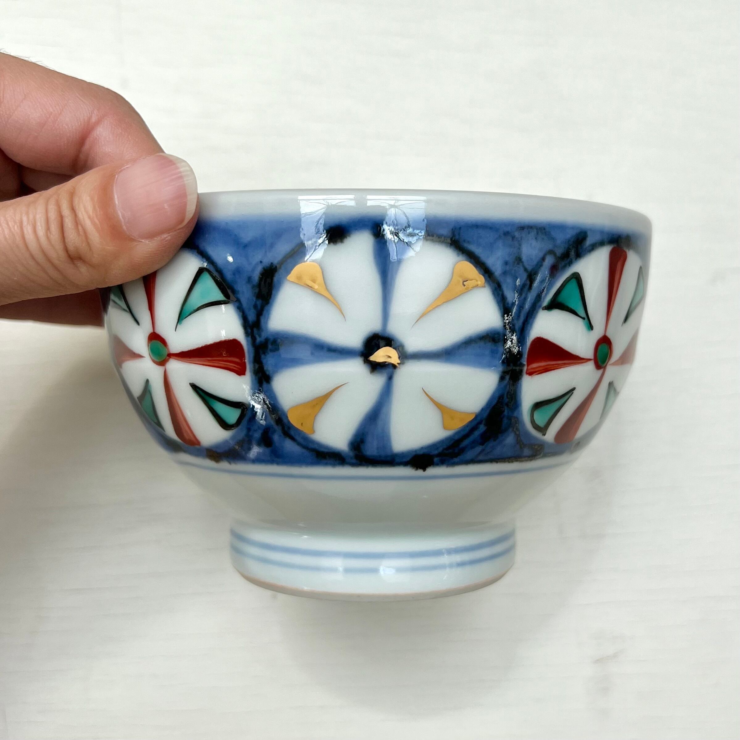 2種類のかざぐるまの柄が器をくるくると囲っていて、藍色に赤・グリーン・金彩の絵付がとても鮮やか。